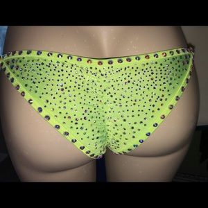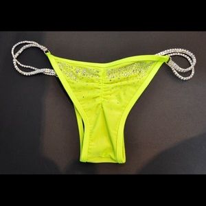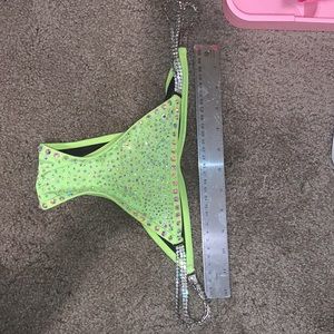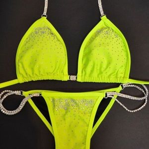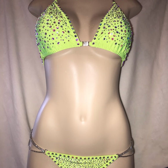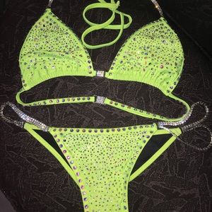 Striker competition bikini. See all pixs to get Tru coloring. I purchased and hand stoned adding to what was there from the maker. This suit is amazing. NWT. Both too and front bottom are lined. Well made. Heavy duty connectors. S/m bottom Brazilian cut and c/d/dd cup. Unfortunately doesn’t fit as I finish my prep. Price reflects the money I spent on crystals and my time. This suit is amazing. And would rock the stage