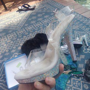 Used bikini medium top and bottom. Size 8 heels and fuzzy slippers! Never used black silk robe earrings and bracelet.
