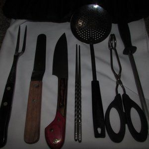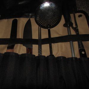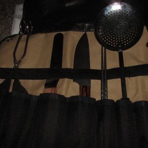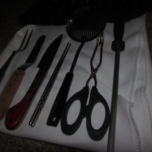 Complete Knife Bag w/ Starter Chef Set. 7 piece set mix of new and vintage items. with a hand crafted never used Damascus chefs knife, metal chop sticks, and some other cool cooking items shown in the pictures. MOSTLY all you need to cook anything right away. and questions just ask