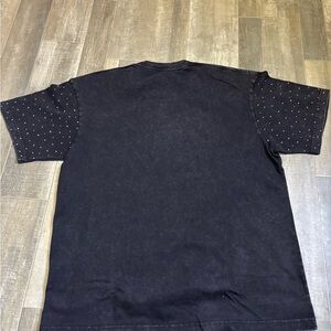 Black mineral wash t-shirt featuring 'COMP DAY' rhinestones. Studded sleeves add a stylish touch.