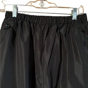 Size large. Black zippered side pockets. Elastic at hem line. Water resistant. Look like Rev pants. Waist elastic pulls to 36” front rise 10.” Inseam 38”. In excellent shape.