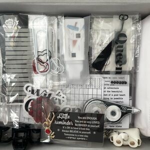 3 Composition Bridal Notebooks with 3 pens, 1 pink Marker, white notepad with white pen. 3 Bookmarks, pencil case, Notebook book light plus key chain and 2 free gifts.