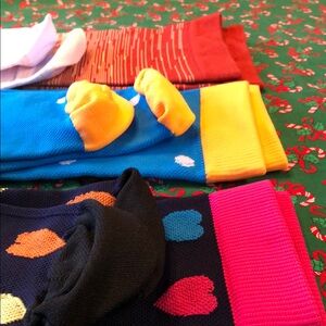 Set of colorful socks with various patterns. Includes blue with polka dots, black with heart shapes, and striped designs. All 3