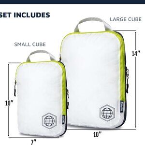 🧿HOW MUCH DOES THIS SET HOLD? Each set contains a different assortment of packing cubes. Large bag holds a week worth of shirts/ medium holds a week worth of underwear/socks. Example: Large holds rainjacket, zip hoodie, Longsleeve tshirt, and a cardigan. Small will hold 5 womens size medium tshirts. Large Dimensions Compressed size: 14x10x1in Expanded Size : 14x10x4in Small Dimensions Zipped/Compressed size 10x7x1in Expanded Size: 10x7x4in Additional bag sizes shown in picture gallery.