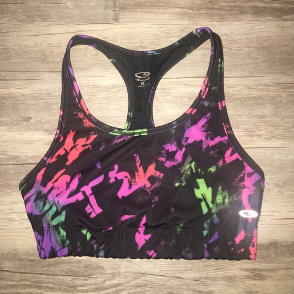 Multi-color racerback sports bra with black background | 84% polyester & 16% spandex | Made in Egypt | pairs well with your favorite tank top & black shorts while working out 🏋