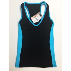 Lino Fitness scoop neck tank with racerback tank. Contrasting color piping and wide thick side panels for a slimming silhouette.
