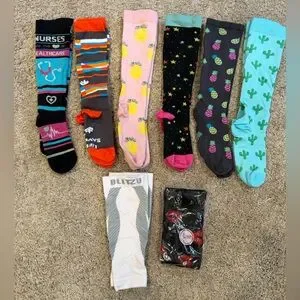 A collection of colorful patterned compression socks. Includes designs with stripes, hearts, and fun motifs. 7 regular pair and 1 calf compression, perfect to wear with jogger scrubs. All in great condition, no holes or sole wear.