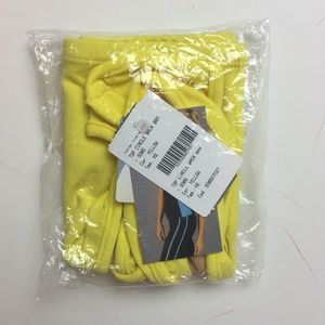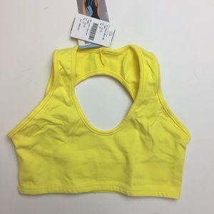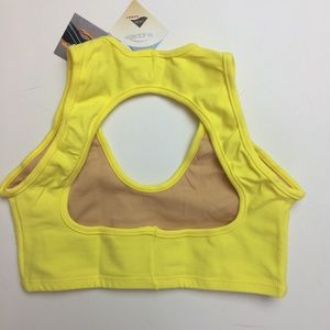 Lino Fitness scoop neck sports yellow bra top with an open back. Waistband elastic underneath the chest for extra support. Lined in the front.