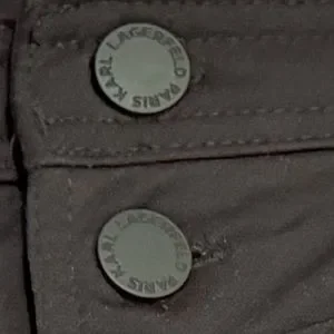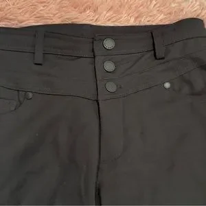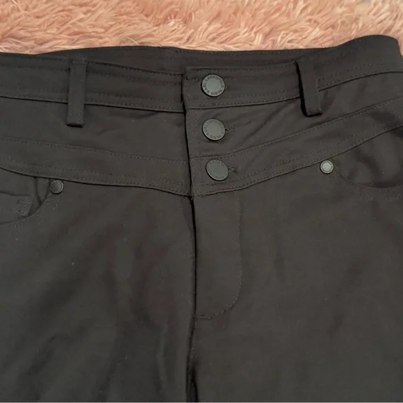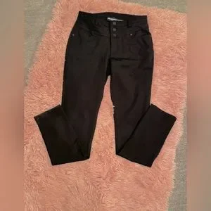Zip fly with three button closures, Five-pocket silhouette, Belt loops, Slim-leg silhouette,Black wash, Imported, Nylon/rayon/spandex, Never Worn !