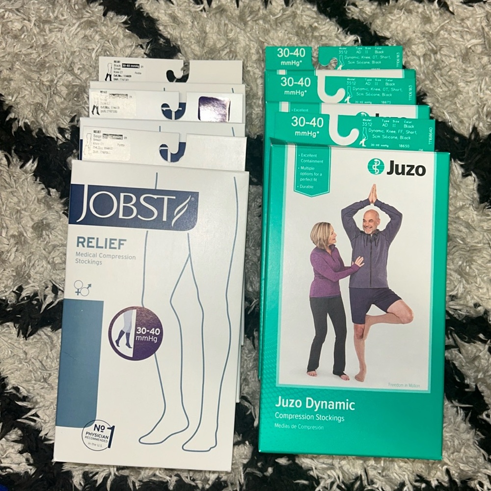 All socks are brand new, never worn. Jobst are all size small and 30-40 compression; one black pair, two beige pair. Juzo are all size 2 and 30-40 compression, black.