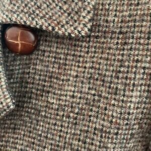 Brown tweed. Double breasted with intentionally crackled wooden buttons. Front slant zip pockets. Long sleeves with three button cuffs. Contrast elbow patches. Fully lined. Wool blend. European size 36, which is a US small. See measurements for best fit to US conversion. Excellent used condition - no rips, tears, or stains. Flat lay measurements are approximate.