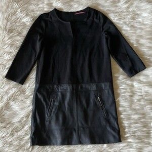 Very cool mixed media dress, ponte knit on top, leather skirt.
