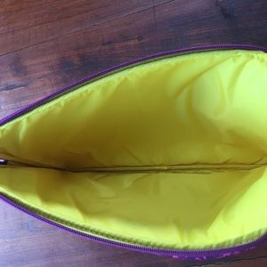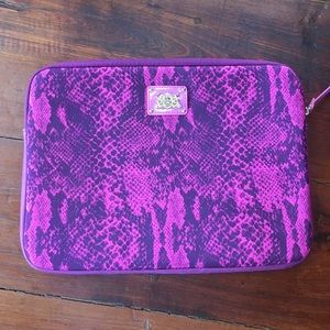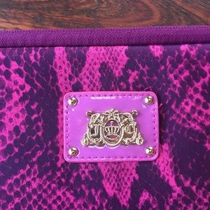 10 inches wide and 14 inches long. Purplish pink with Juicy Couture logo.