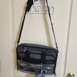 Samsonite Computer Case - black. Never used - tags still on. Fits computers/tablets up to 13.5". Front has three zippered pockets, back has a strap that can go over a suitcase handle. Inside has a padded sleeve for protection for your computer or tablet, 3slide in pockets, and a zippered pocket. It also has 2 carry handles in addition to and adjustable shoulder strap. Case has a lot of storage and is very well made.