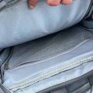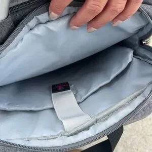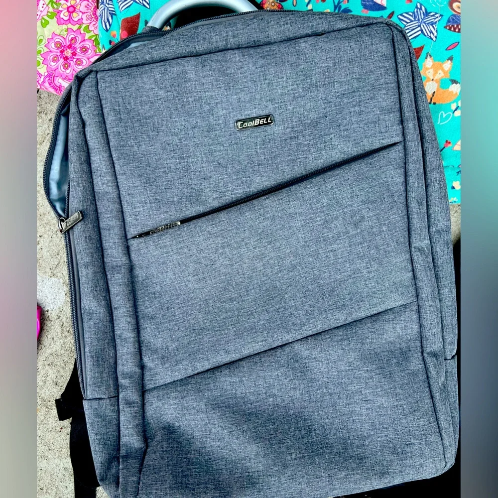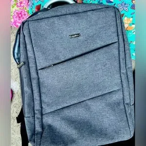 Heather gray computer backpack with 3 zippered compartments. Structured so everything stays put and doesn’t get damaged. No issues.
