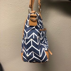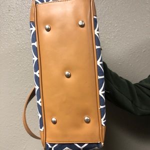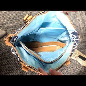 This is a navy and cream canvas bag trimmed in tan leather. It is well insulated and in good condition. The dimensions are approximately 15”x12”x5”.