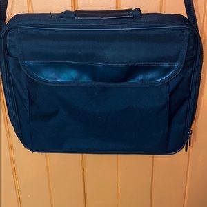 Black in color has a pocket on the front on the back and one inside also has a carrying handle on the top and a cross body strap Fits a 15 inch computer