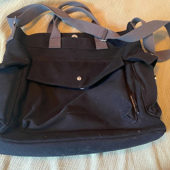 Canvas computer satchel. Very roomy. Side pockets snap. Strap extends. Machine washable.