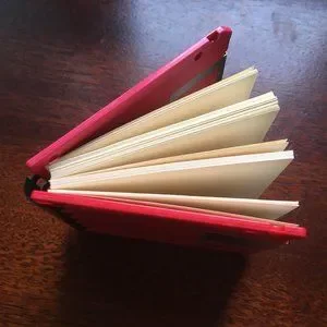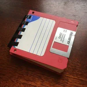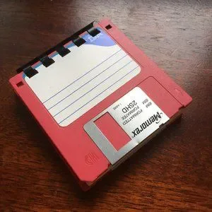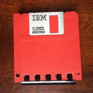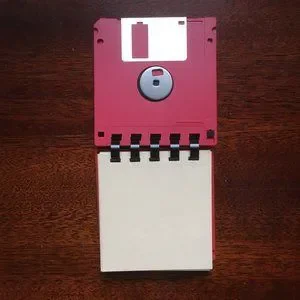 Computer floppy disk notebook made with two red vintage floppy disks from the 1990s, spiral-bound with off-white plain paper pages. Cute nostalgia gift or office decor. Handcrafted item purchased around 2006 and never used. Memorex disk on the front has a blank label that could be customized. IBM disk on the back has no label.