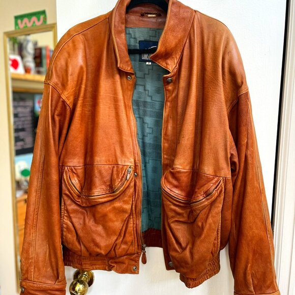 For sale as-is. This jacket features buttery soft leather, a cozy cotton Aztec-print lining, and smooth satin-lined sleeves. It’s well-loved with visible wear and character—please note some scuffs and marks on the leather (pictured).