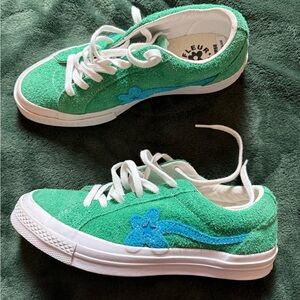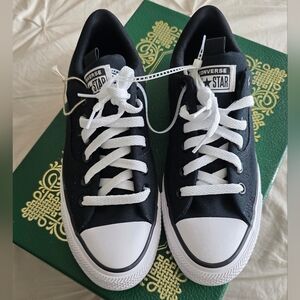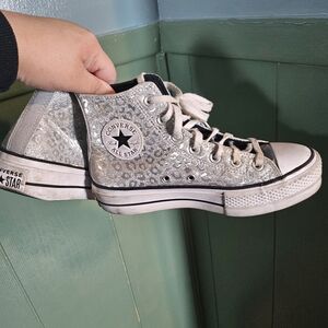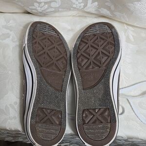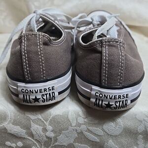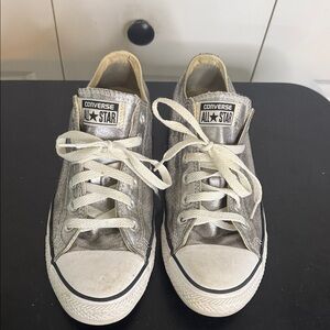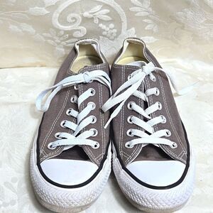 Classic gray Converse low-top sneakers with white laces. Lightly worn..white could use a little whitening. Also have in blue