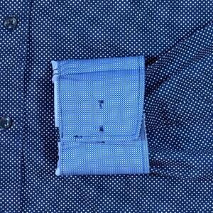 Color: Navy with micro-dot pattern, light blue contrast cuffs & inner collar, Flip Cuff