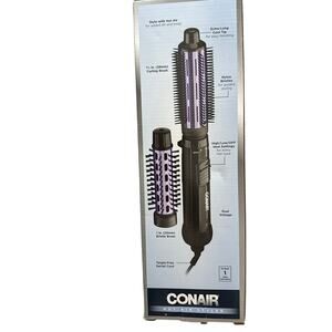 Brand new in box. This Conair Hot Air Styler includes two interchangeable brush heads for versatile styling. Great for volume, curls, and smooth waves. Lightweight and dual voltage, perfect for home or travel.
