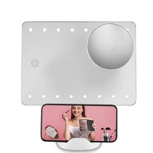 White phone holder with LED lights around the mirror. Features three light settings and a small round mirror to increase power 10X. Your phone can be held in several directions while you get ready - or while you stream a GRWM video. Battery operated. Sizing: 10.5 H X 8.5 W. Folds flat when being put away.
