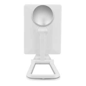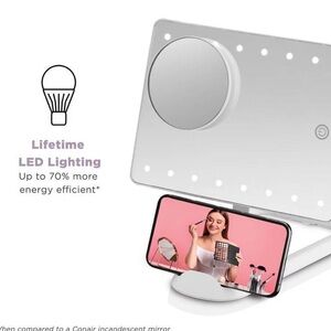 White phone holder with LED lights around the mirror. Features three light settings and a small round mirror to increase power 10X. Your phone can be held in several directions while you get ready - or while you stream a GRWM video. Battery operated. Sizing: 10.5 H X 8.5 W. Folds flat when being put away.