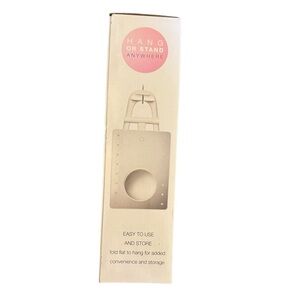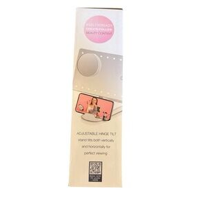 White phone holder with LED lights around the mirror. Features three light settings and a small round mirror to increase power 10X. Your phone can be held in several directions while you get ready - or while you stream a GRWM video. Battery operated. Sizing: 10.5 H X 8.5 W. Folds flat when being put away.