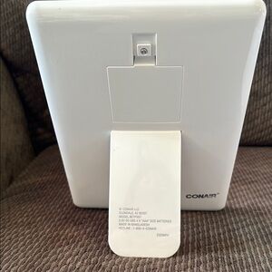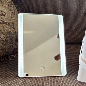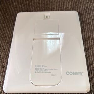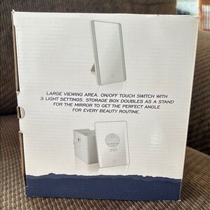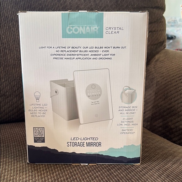 Crystal clear LED-lighted storage mirror by Conair. Perfect for makeup application and grooming. Battery operated with adjustable light settings.