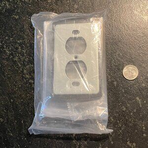 This set of three concealed mount outlet cover plate in matte black are new. The package was opened for the purpose of the photos. I also divvied up the package of three mounting screws so one would be with each plate set. The product description describes them as "1-gang duplex outlet wall plate covers." (I have not heard that term before.) The outer plate is made of black ABS plastic; the base plate is made of zinc plated steel. That the outer cover is plastic is not obvious. The outward look and feel is that of matte black metal. The base plate installs with the single black screw. The matte black cover snaps on over it.