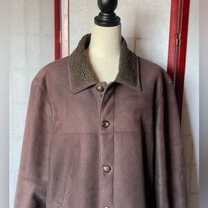 This jacket has suede material on the outside with brown Sherpa lining. Button down with pockets on each hip and collar on the top. This jacket is in great condition, and will keep you nice and warm.