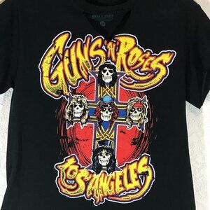 Guns n Roses concert tour t-shirt. This is from the Los Angeles Niot in this Lifetime tour. The shirt has been hand customized with a cutout in the neck and the sleeves and bottom hem have been cut to make it appear a little distressed. The size is small and measures pit to pit 17 and length 22.5.