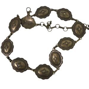 Add a touch of bohemian, rustic charm to your outfit with this stylish concho style chain belt. It features large, ornate medallions with a diamond-shaped design in the center and detailed scalloped edges.