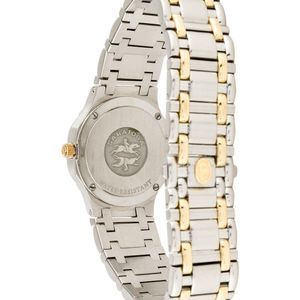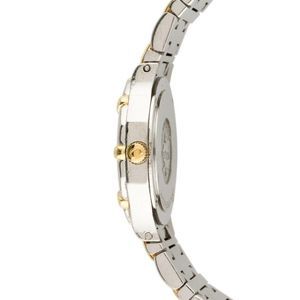 Stainless steel and 18K yellow gold 23mm Concord Saratoga watch featuring a quartz movement with fixed bezel, silver dial and link bracelet with butterfly clasp.
