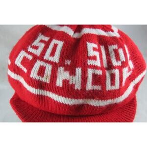 Vintage knit cap with pom pom and brim. This hat has So. Side Concord knitted two times into the top. This refers to a former bowling alley called Concord Bowl located in south county, St Louis, Missouri. It shows some signs of use, including a bit of stubborn soiling as shown but is overall clean, bright, free of holes and tears. It is missing its hang tag, so maker is unknown.