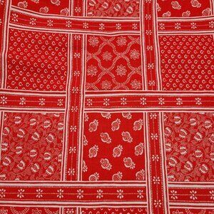 Concord Fabrics Inc cotton fabric, red background with white panels containing various patterns. Medium weight fabric. Made in the USA.