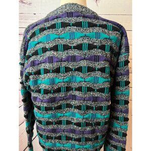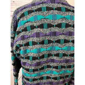 Concrete Mix Sweater Pullover Sweater Large 100% Acrylic 3D Chunky knit design colorful in black, purple and aqua blue. Ribbed cuffs and waist. Machine washable. Crew collar. Made in Hong Kong. Grandpa chunky knit sweater has Pit to end of sleeve 24", pit to pit 23", back bottom of collar to bottom of sweater 26". Bill Cosby ish design retro / vintage. Great preowned condition with no rips or stains. Perfect for the retro Y2K dress up cosplay vtg fashion.