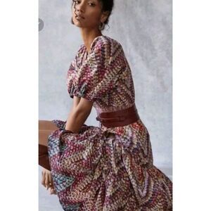 Add a pop of color to your wardrobe with this beautiful Anthropologie plus size dress from Conditions Apply. Featuring a unique geometric pattern in vibrant multicolors, this dress is perfect for casual occasions in the summer, fall, or spring. The V-neckline and puff sleeves add a touch of bohemian and peasant style, while the midi length and pullover closure make it easy to wear.