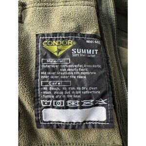 Condor Summit Soft Shell Jacket. Jacket is done in olive green called "Olive Drab." It's made of 100% polyester and is a man's size large. Org. list price $128.95.