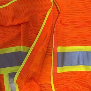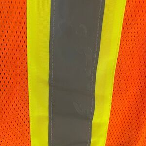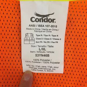 Condor Orange Mesh Reflective Safety Vest Size L/XL There are a few spots on the right reflective strip. Please see pictures. Stay visible and safe with this Condor Orange Mesh Safety Vest. Ideal for construction, roadwork, school crossing guard, directing traffic or any outdoor activities requiring enhanced visibility, this vest combines functionality with comfort in its lightweight, breathable design.