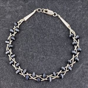 Title: Sterling Liquid Silver 925 Cone Tip Braided Black Synthetic Cat's Eye Bracelet 7.75"