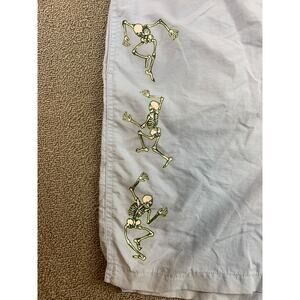 These light blue shorts from Coney Island Picnic feature a bold graphic of dancing skeletons. The design includes a globe with a peace sign and the slogan "Let's PEACE it together!".