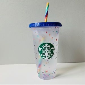 -1 Starbucks confetti color changing plastic cup with 1 blue lid and 1 rainbow swirl straw