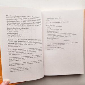 Conflict Free Living: How to Build Healthy Relationships for Life by Joyce Meyer. Interpersonal conflict is causing serious damage and difficulties in our lives. Its destructive effects are straining marriages, embittering our children, and causing discord in our churches. Even our daily commute is often affected by hostility and aggression. What if things could be different? What if every area of your life (yes, even your morning commute) could be free from conflict and strife? What if ALL of your relationships could be filled with love and excitement? New Old Stock. Hardcover. Approximate Measurements: 6.25”x9.25”x1” 220 Pages.