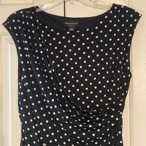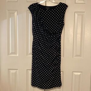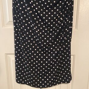 Very pretty lightweight polka dot dress. Perfect for work attire or an evening out. Very flattering cinching around the waist. Little cap sleeves. Ready to wear.