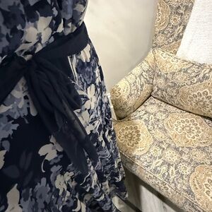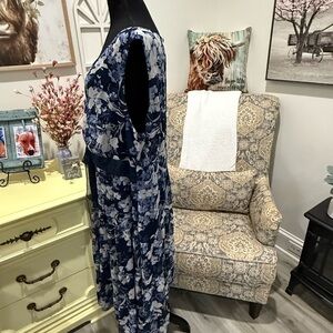 This elegant sundress by Connected Apparel features a stunning blue and white floral pattern, perfect for a wedding guest or cocktail event. The sleeveless design with a scoop neckline and wrap style offers a flattering fit, while the midi length adds a touch of sophistication.