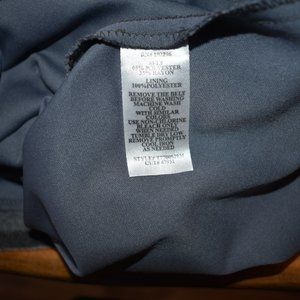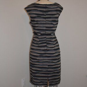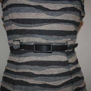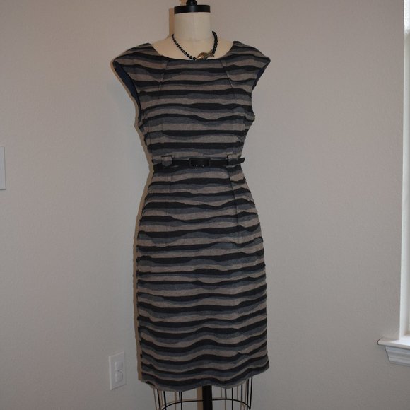 Connected Apparel Cap Sleeve Dress. Fitted blue, gray, black striped with an adorable black belt at the waist. Zipper down the back and a small slit and the bottom hem. Perfect for the office or dress it up with some heels and jewelry for a night on the town. Women's size 10