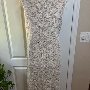 Stunning sleeveless NWOT lined cream lace/gold sparkle dress with a flattering draped neckline. Ideal for elegant events.